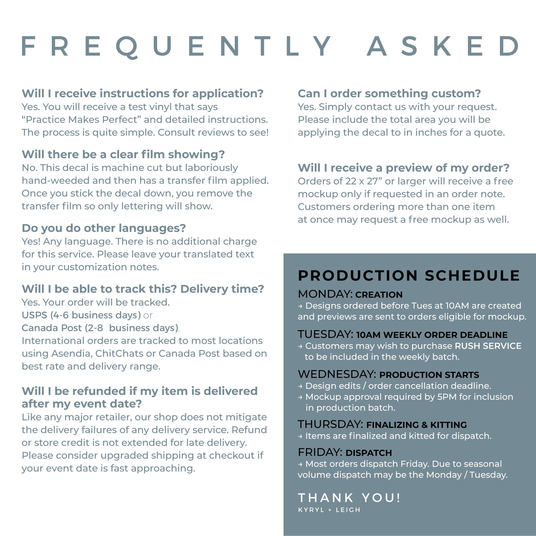 Production: Every order in by Tuesday at 10AM Eastern will generally ship the following Monday in our weekly production run. RUSH SERVICE is available for purchase up until Friday at 5PM (Eastern).