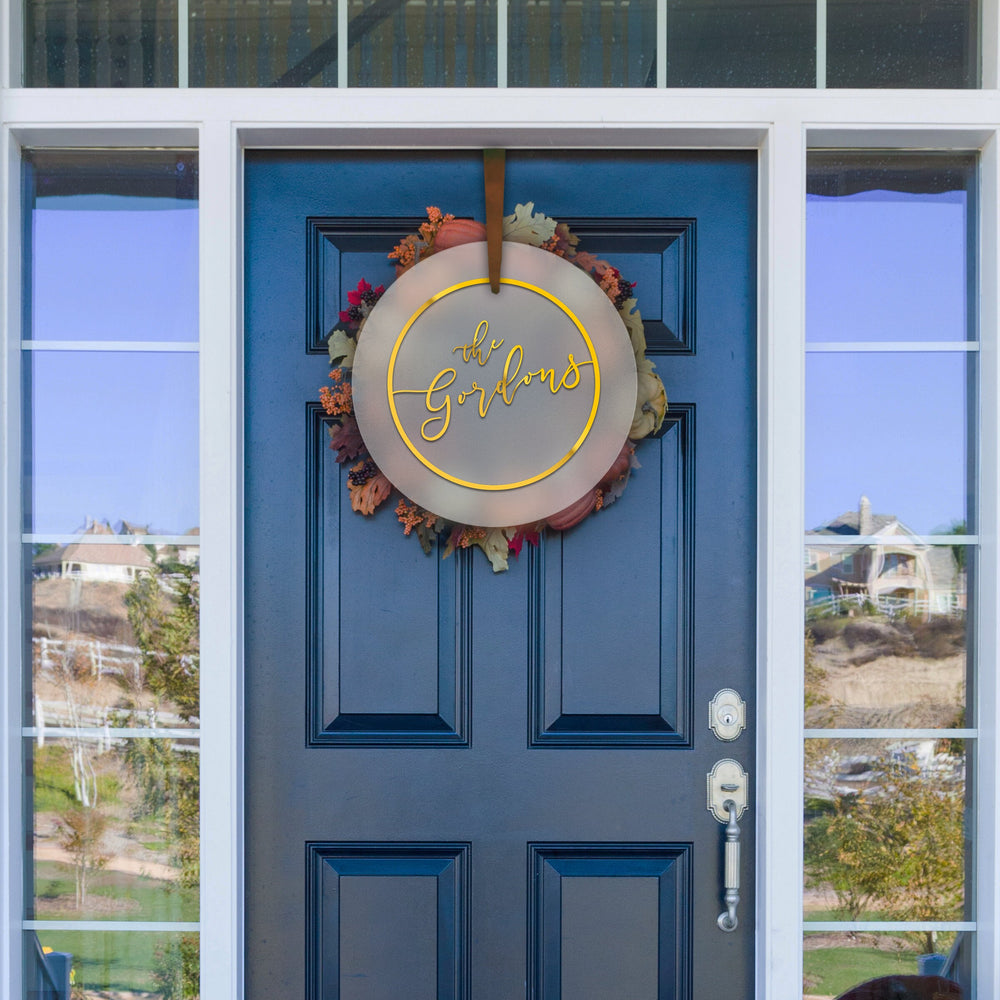 Make a striking first impression with our customizable and original and modern, minimal front door wreaths. Flowing and reflective cursive bounces light around porches even in the winter months. Timeless throughout all seasons, you may choose to overlay our wreaths over your own florals for a traditional style or hang it simply on it's own for a modern and minimal look. Ribbon is included but changes seasonally.