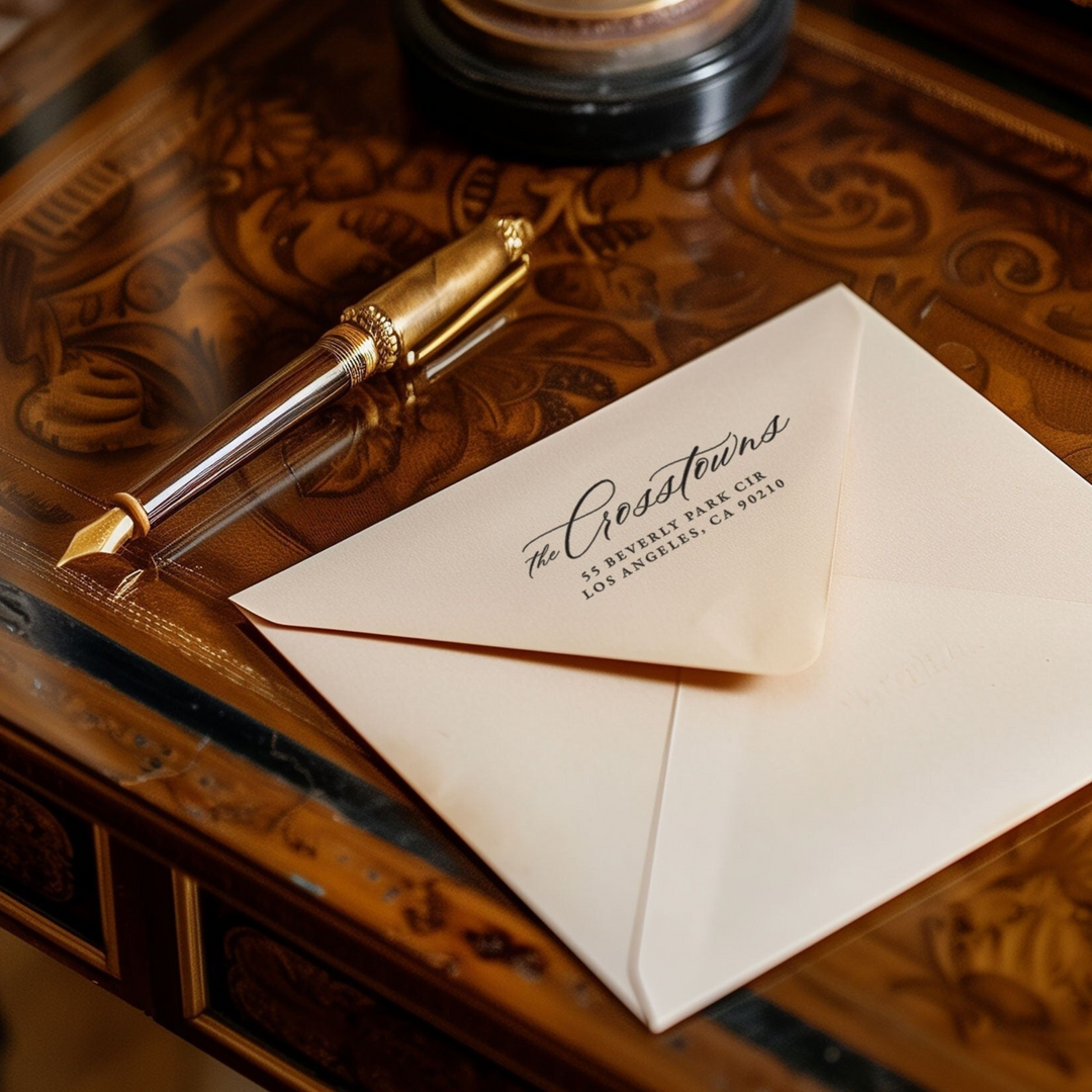 Masterful calligraphy pairs with a modern sans-serif font to evoke the rich pomp of a royal wedding. Capture an aesthetic of regal opulence and transport guests to a stately palace.