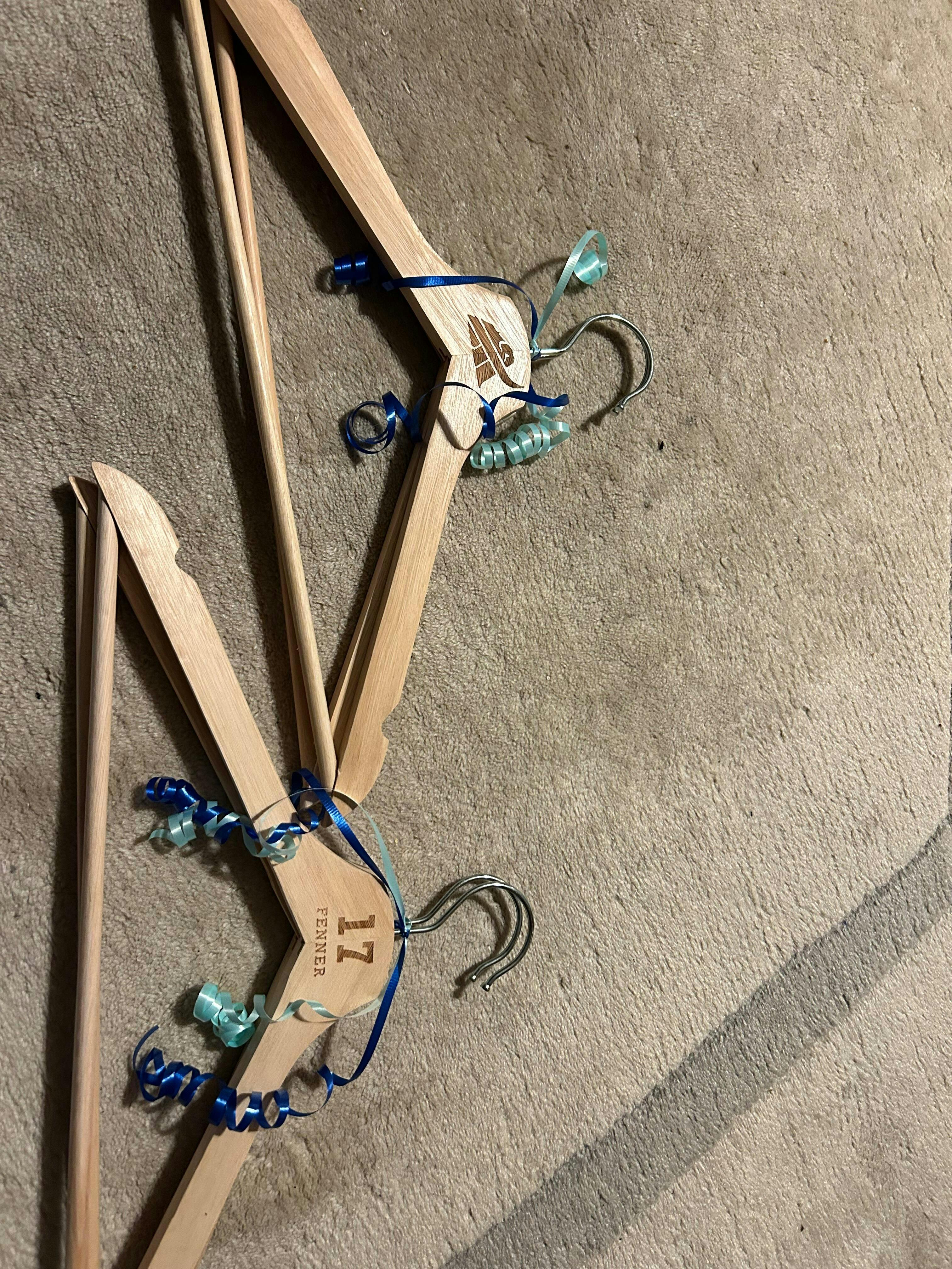 Our custom laser engraved wooden jersey hangers are a great gift for sports teams or individual sporting enthusiasts. Order in bulk for cheer teams, senior night gifts, hockey team locker-rooms or holiday/birthday gifting. Personalized Sports Hangers and are the easiest and most personal way to appreciate your players and keep team attire organized and easily accessible. They also make a great gift for that close friend in a league. Available in white or natural wood.