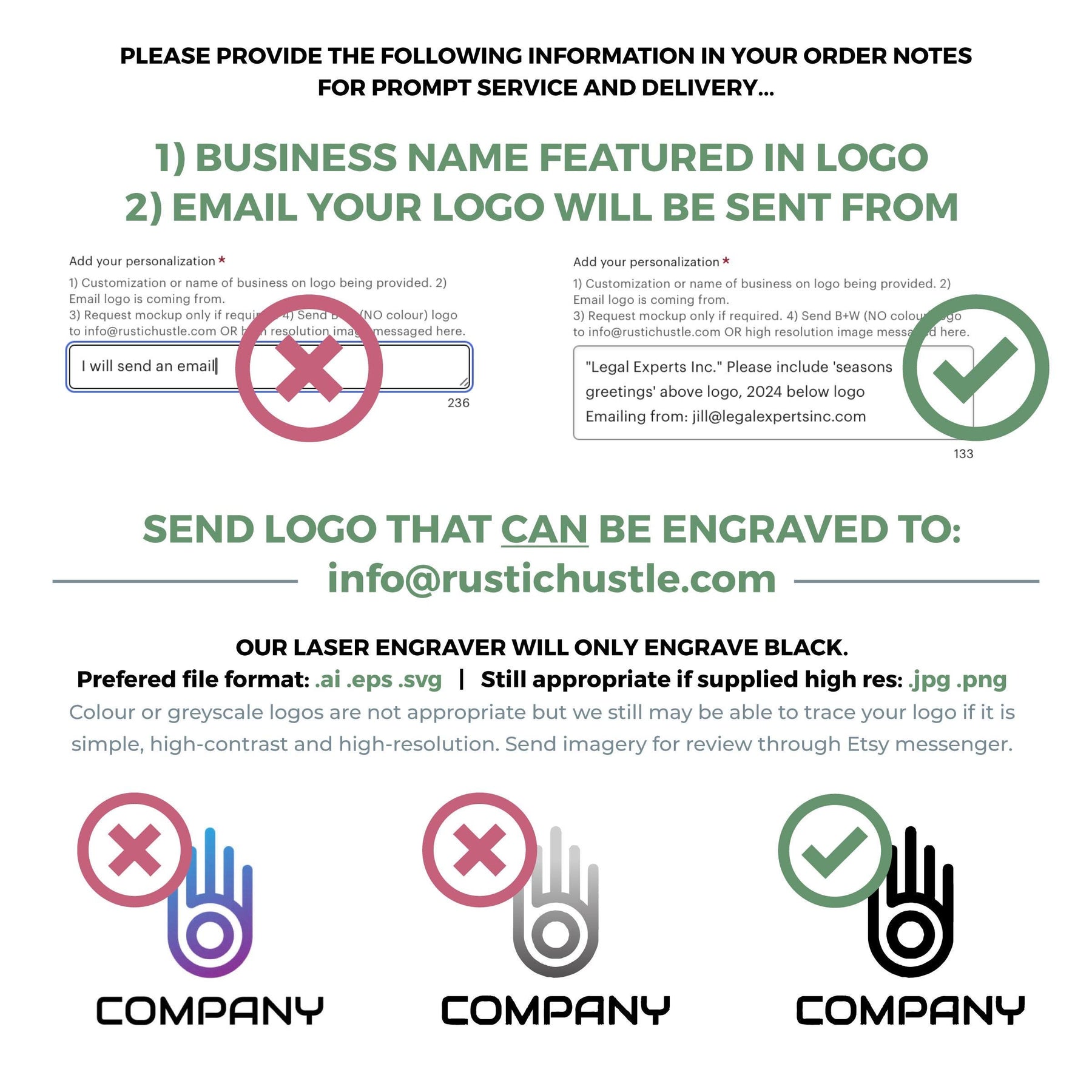2) If you intend to include a logo please 1) NOTE THE NAME OF YOUR BUSINESS LOGO being provided and 2) THE EMAIL IT WILL BE SENT FROM... rather than "I will send an email". Our shop receives hundreds of order per week and your order may be delayed or pushed back due lack of information to effectively match order with email.