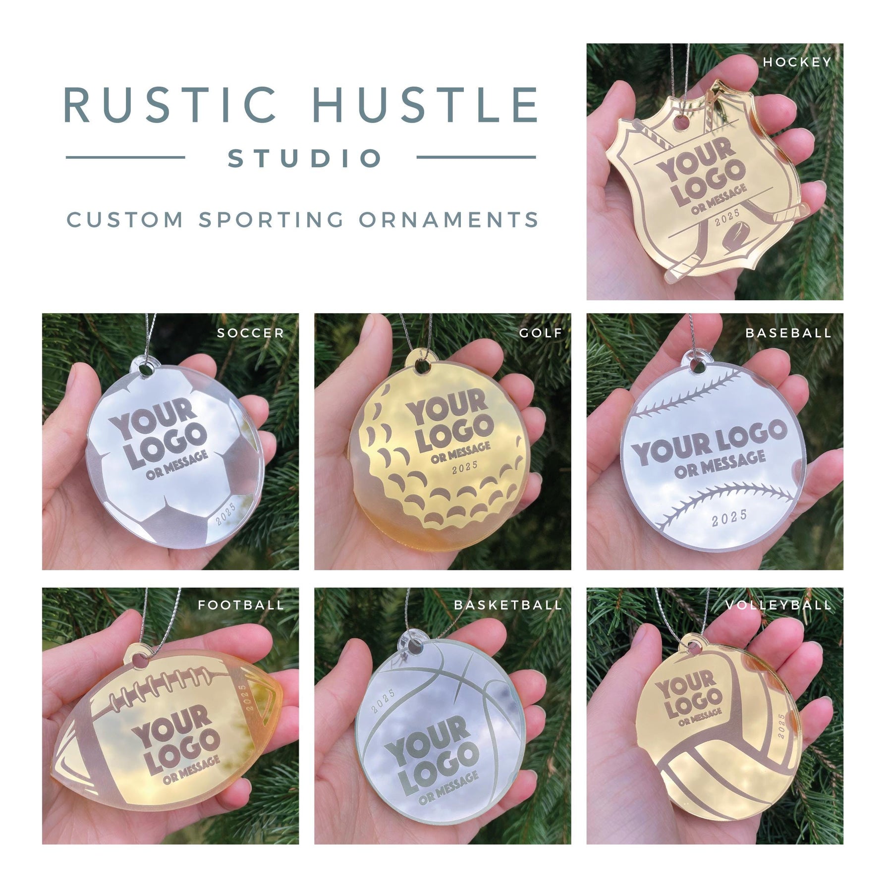 Celebrate your sports team wins this year with our Custom Christmas Tree Ornaments to celebrate the holiday season. This decorative ornament is engraved in reverse, removing the mirrored finish to expose clear acrylic, allowing the lights of the season to shine through magically! They make great corporate holiday stocking stuffers, personalized xmas decor within your office or employee / client / sports team member appreciation gifts to send out. Our laser engraved mirrored acrylic ornaments add a shining accent to your tree or garlands! Select one of our professional designs or work with our designer to create a completely unique ornament just for you.
